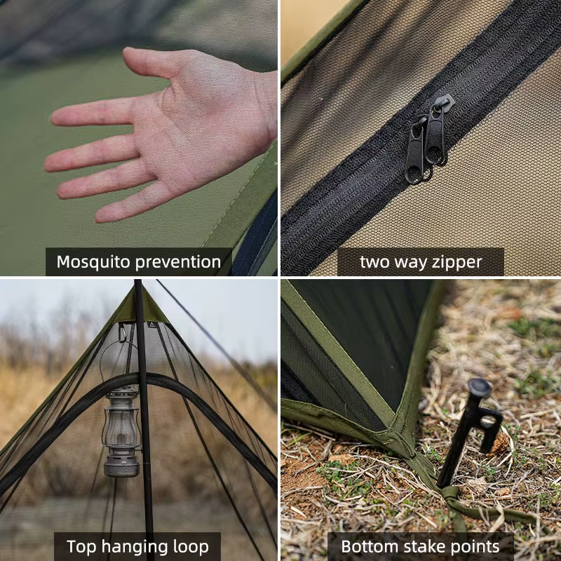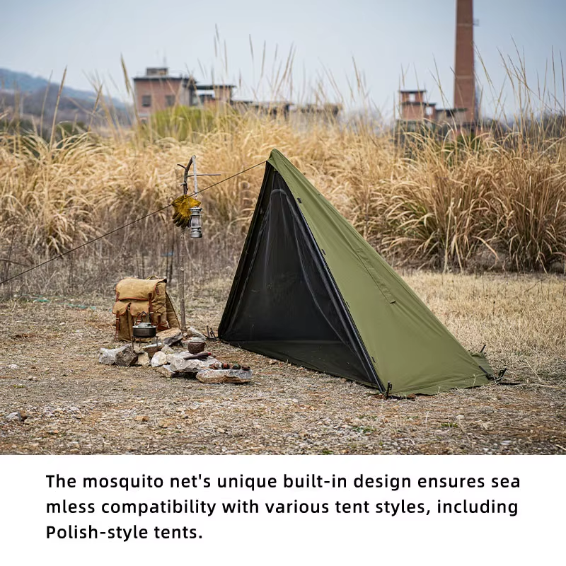 Constructed using a combination of polyester mesh and TC cotton, this shelter balances durability with ventilation. The fine mesh blocks mosquitoes and insects while allowing airflow to pass through freely.