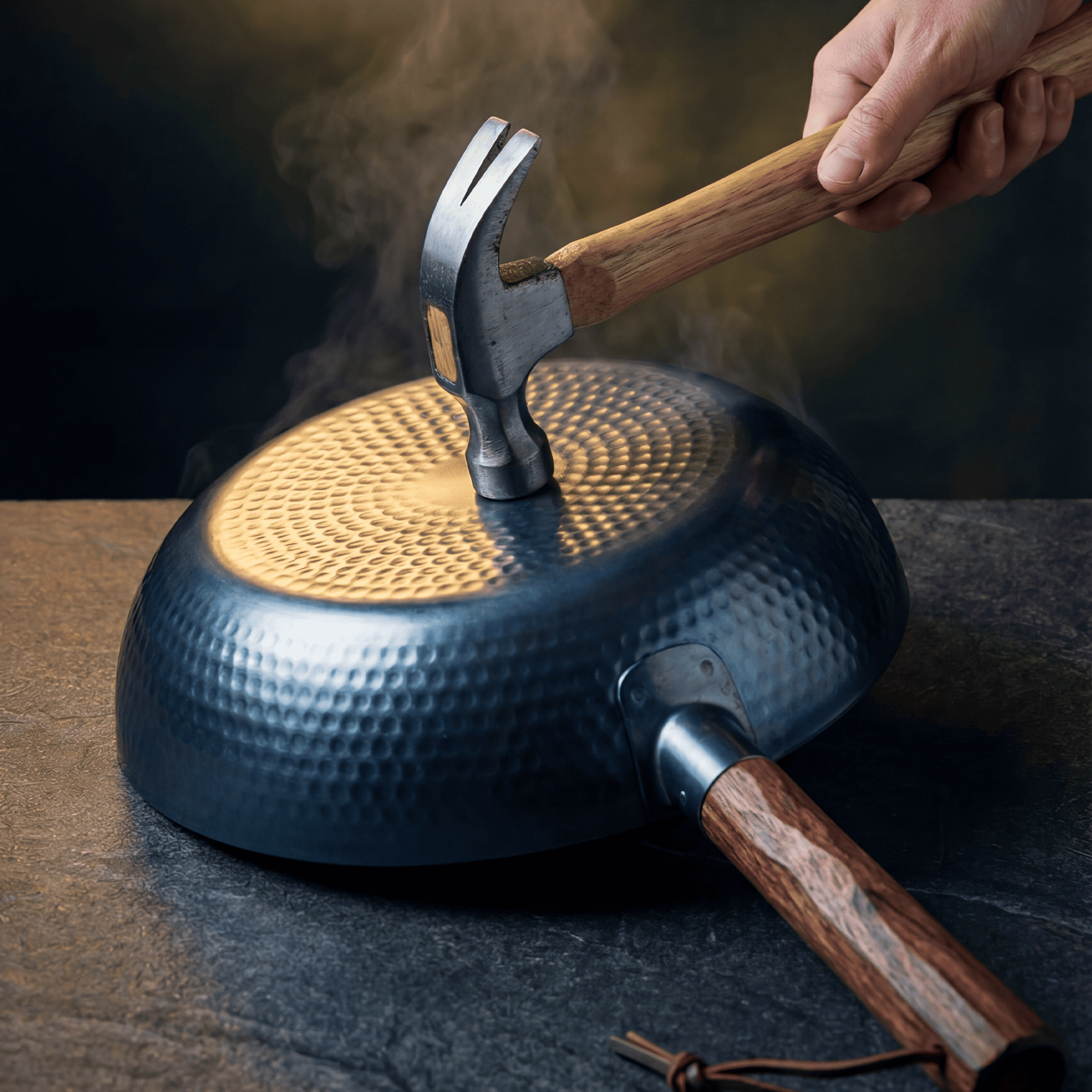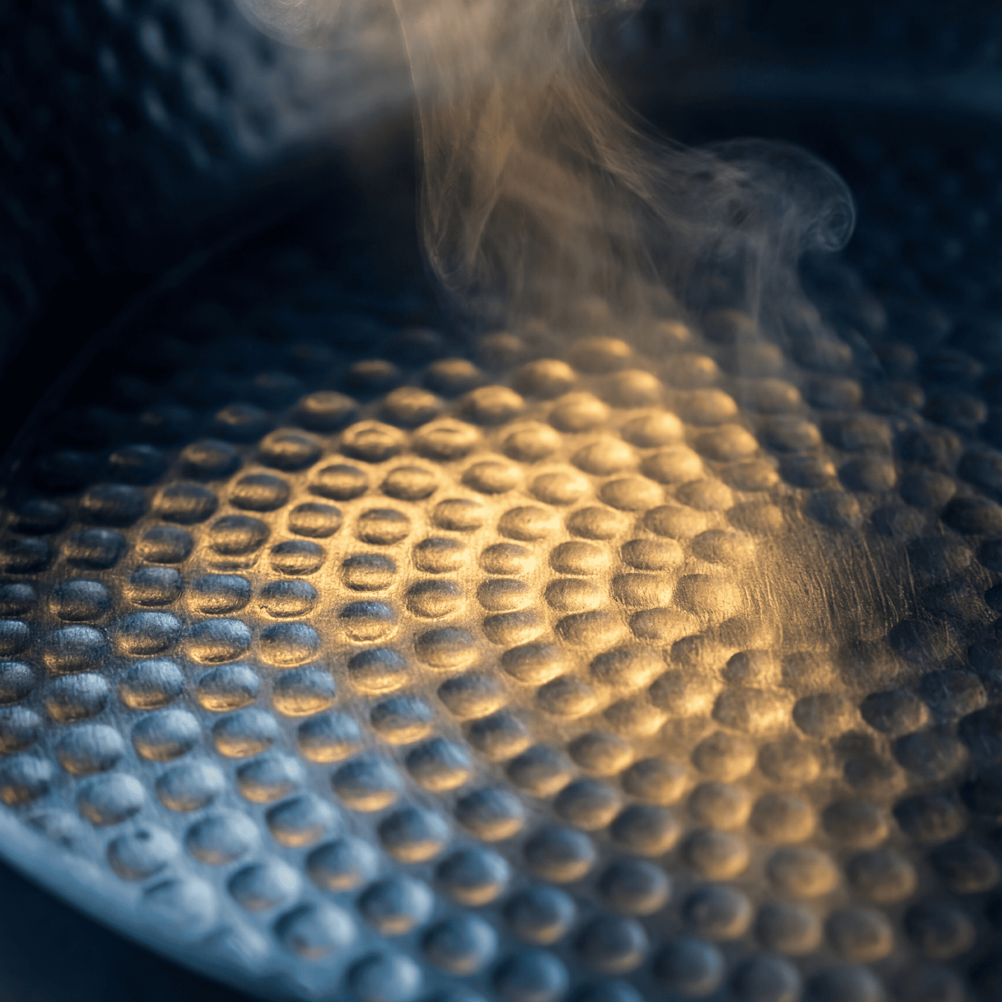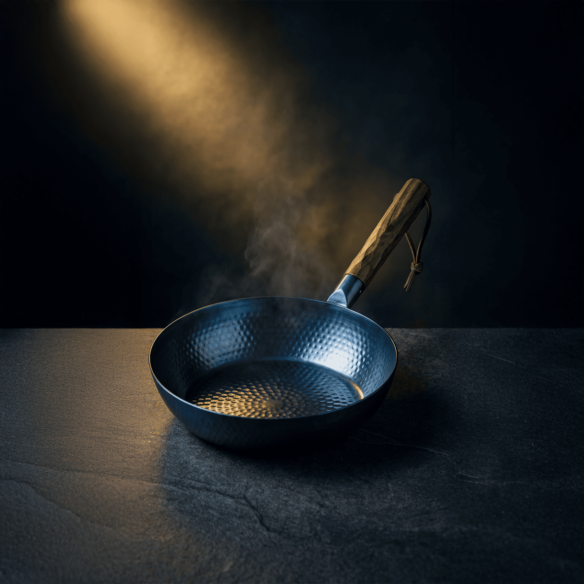 Once seasoned, the forged iron develops a natural non-stick patina. This improves each time you cook, especially with fatty foods. No synthetic coatings are used.