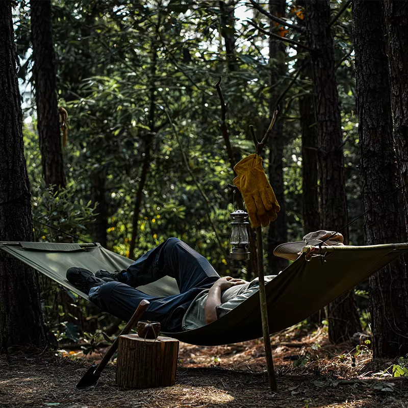 Made from TC cotton fabric, the hammock offers breathability and comfort while maintaining durability for repeated outdoor use. The fabric performs well in warm, humid conditions.